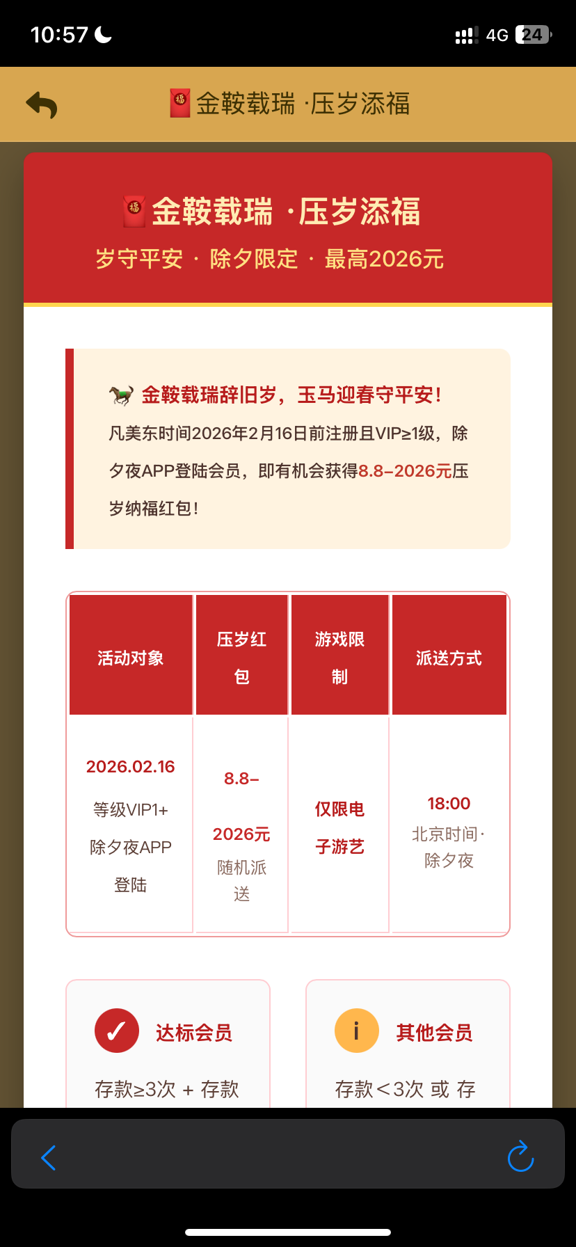老用户凡美东时间2026年2月16日前注册且VIP≥1级,除夕夜APP登陆会员,即有机会获得8.8-2026元压岁纳福红包!保底8.8红包