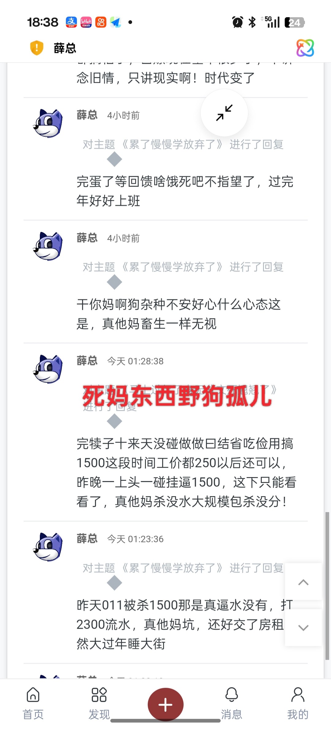凌晨18厘米: 大过年的挂壁了 要发泄的话 就找你妈去卖逼 你妈卖逼了 有钱了你就可以去赌博了