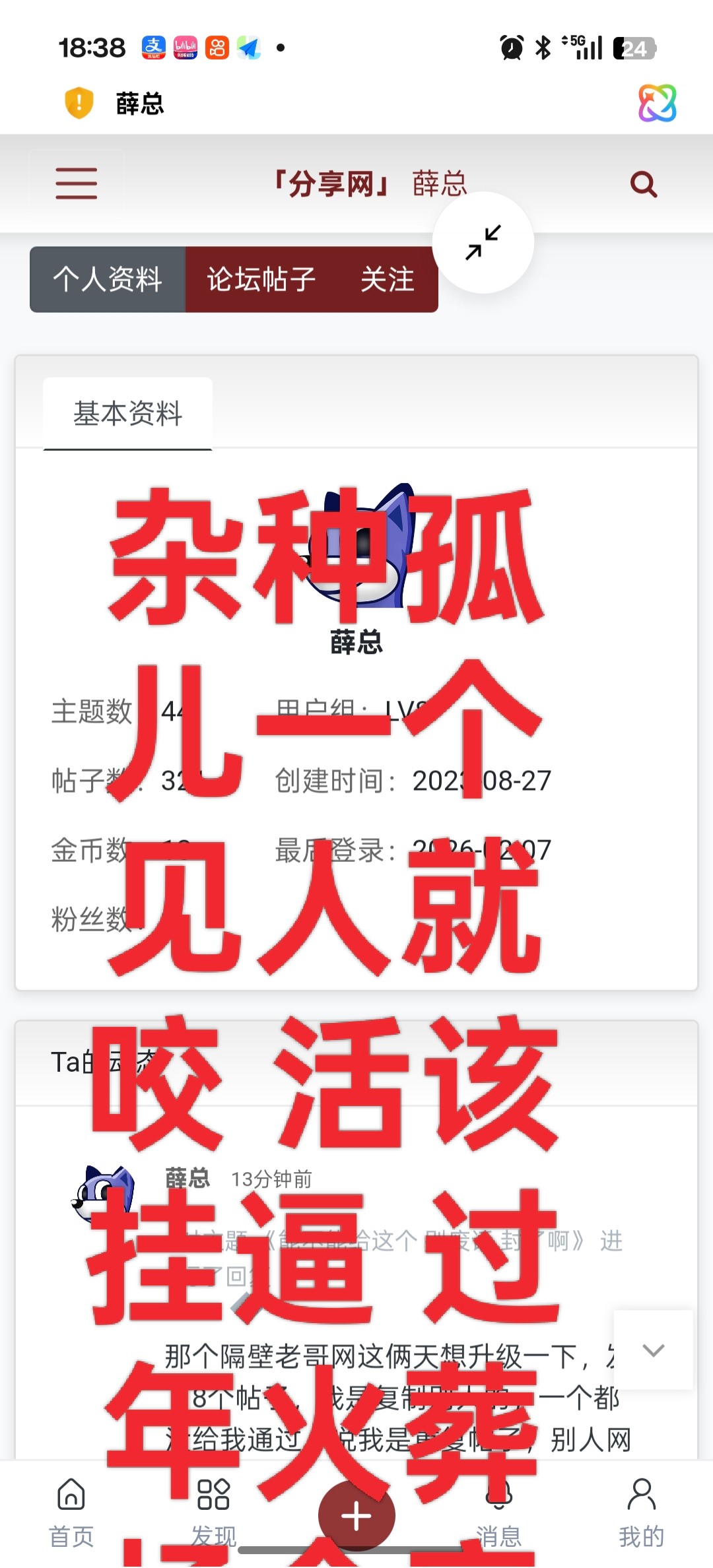 能不能别你妈什么几把都往分享网发,混贴就算了,发的都是些什么几把。蛋蛋也不管。生活过的不如意去找狗庄发泄,别找老哥发泄。我踏马进来找白菜全是什么几把玩意