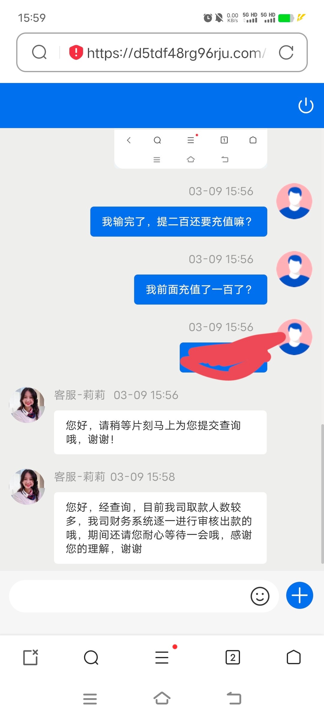 有没有让你自己充值?我现在里面1300    让我充值502打一杯水,我想充值,他们有的充值了提款得,有的黑的