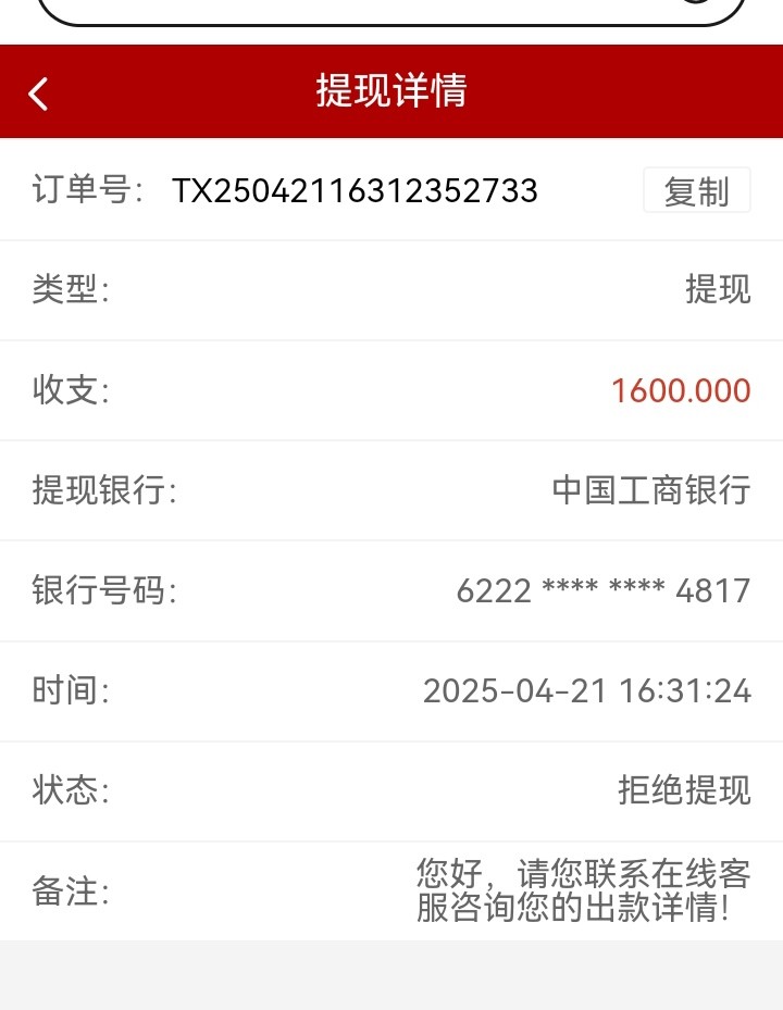 每天在这黑台玩,可能玩的小,一直没黑我,今天存了2088提银行卡1600想去买点东西,居然被拒绝,罚10倍流水