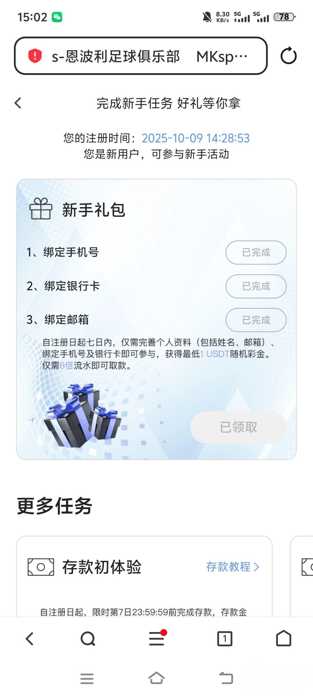 新手礼包绑定一个信息就送1u,前面两个会送到福利中心自己领取,后面一个直接到账一共21块自己选择u钱包还是rmb钱包个人,必须是三合一都是同名,出款自测