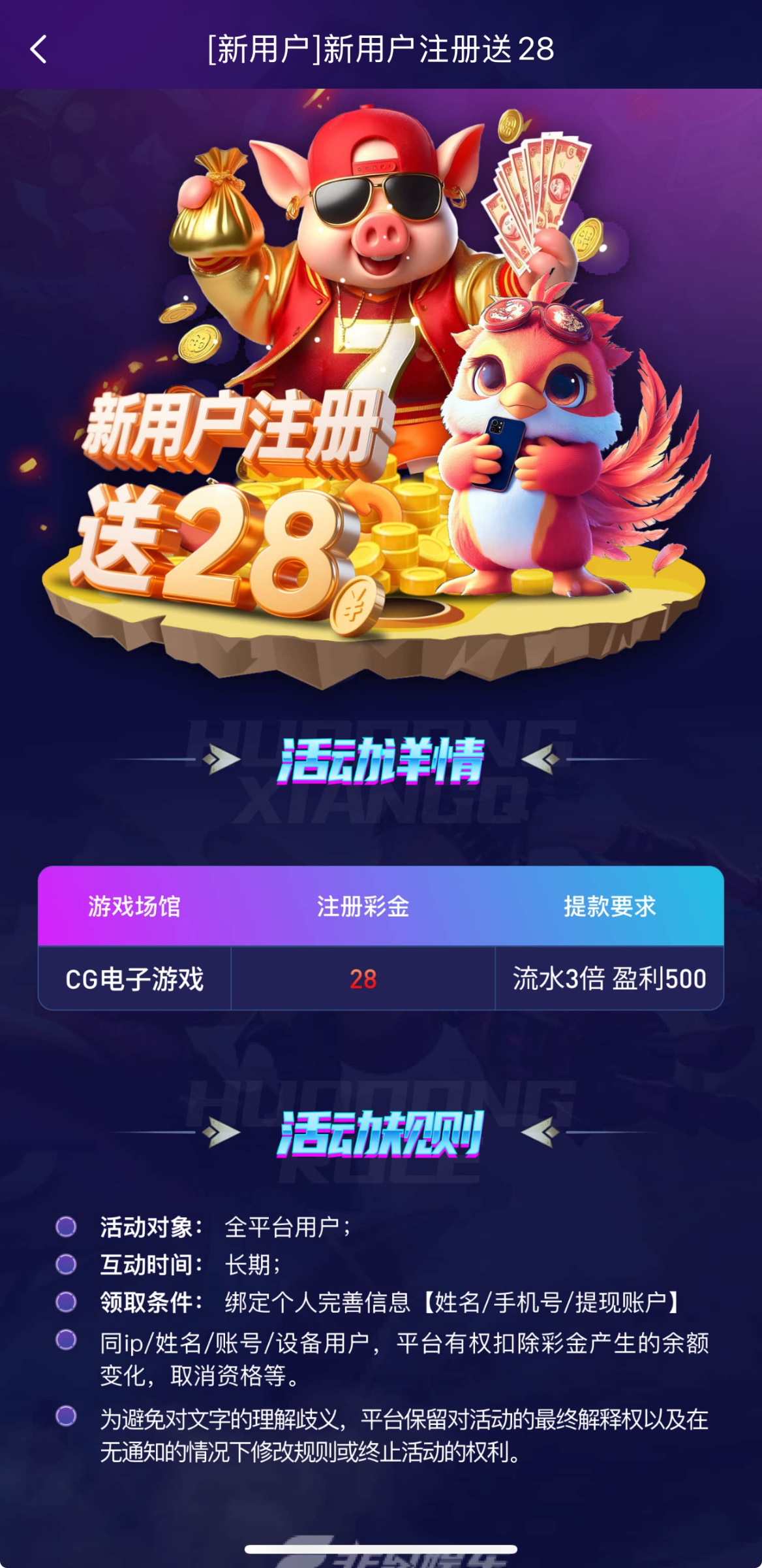 新用户注册后下载app完善资料优惠大厅自助申请28/500提,多账号的别去了包封号,彩金只能玩CG游戏。