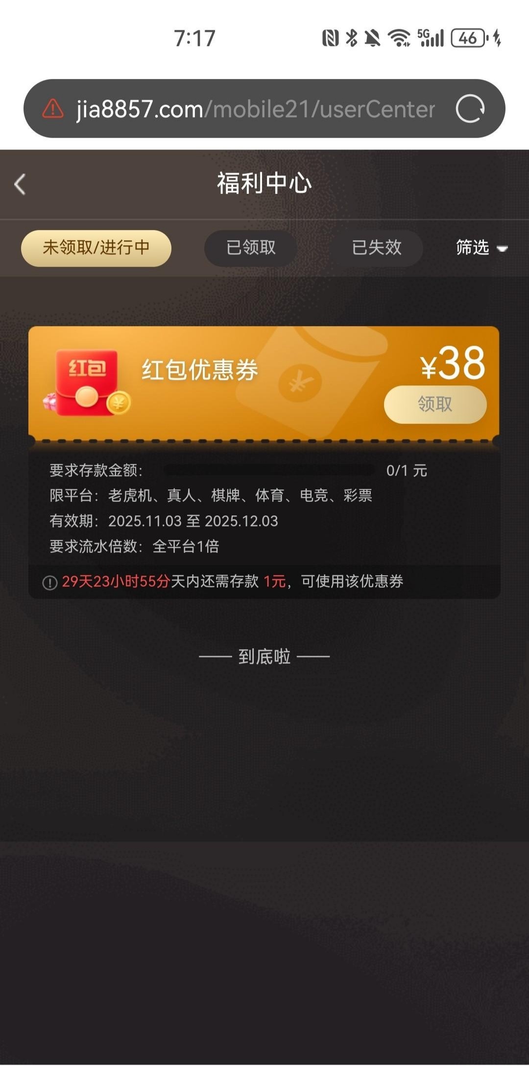 11月1日后的新用户注册送28彩金,出款自测,好像还有个存1送38优惠券,我注册自动到号上了网址https://jia8857.com