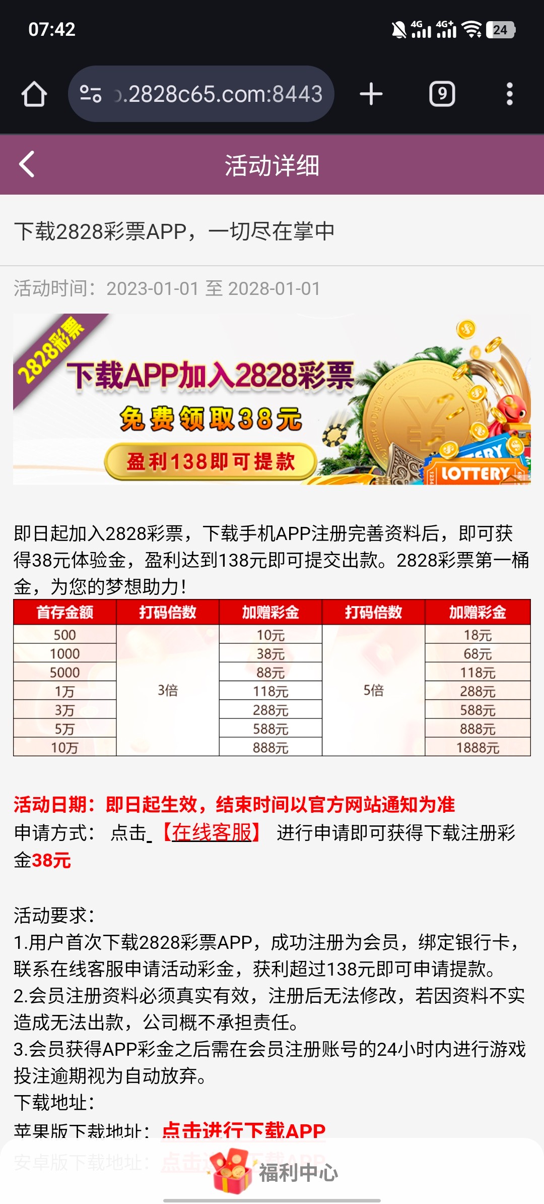 下载手机APP注册完善资料后 点击 在线客服 进行申请即可获得下载注册彩金38元 彩金盈利满138元 即可提现