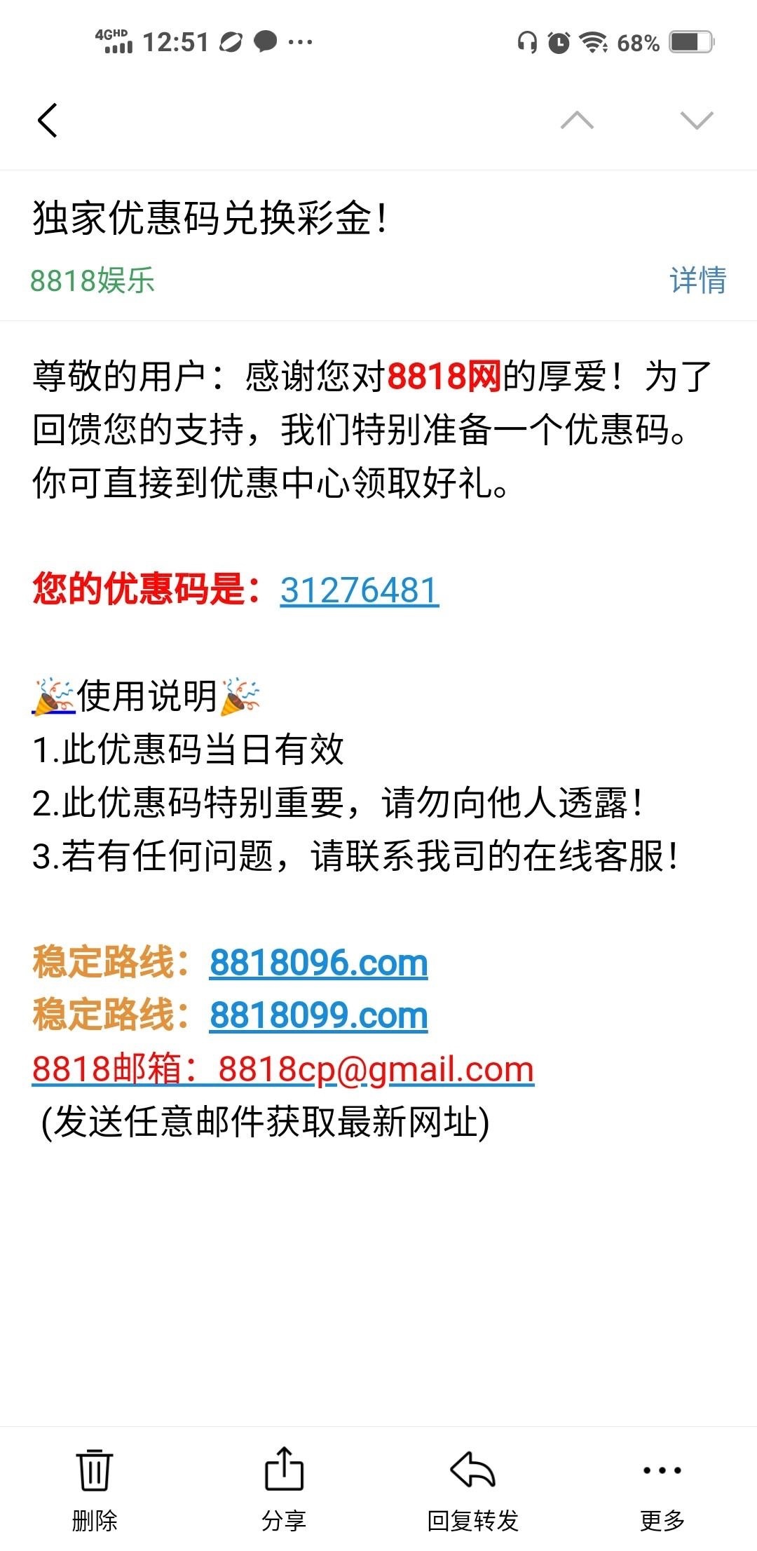 邮箱彩金又来了,历史累计充值100去领,啊8818096.com