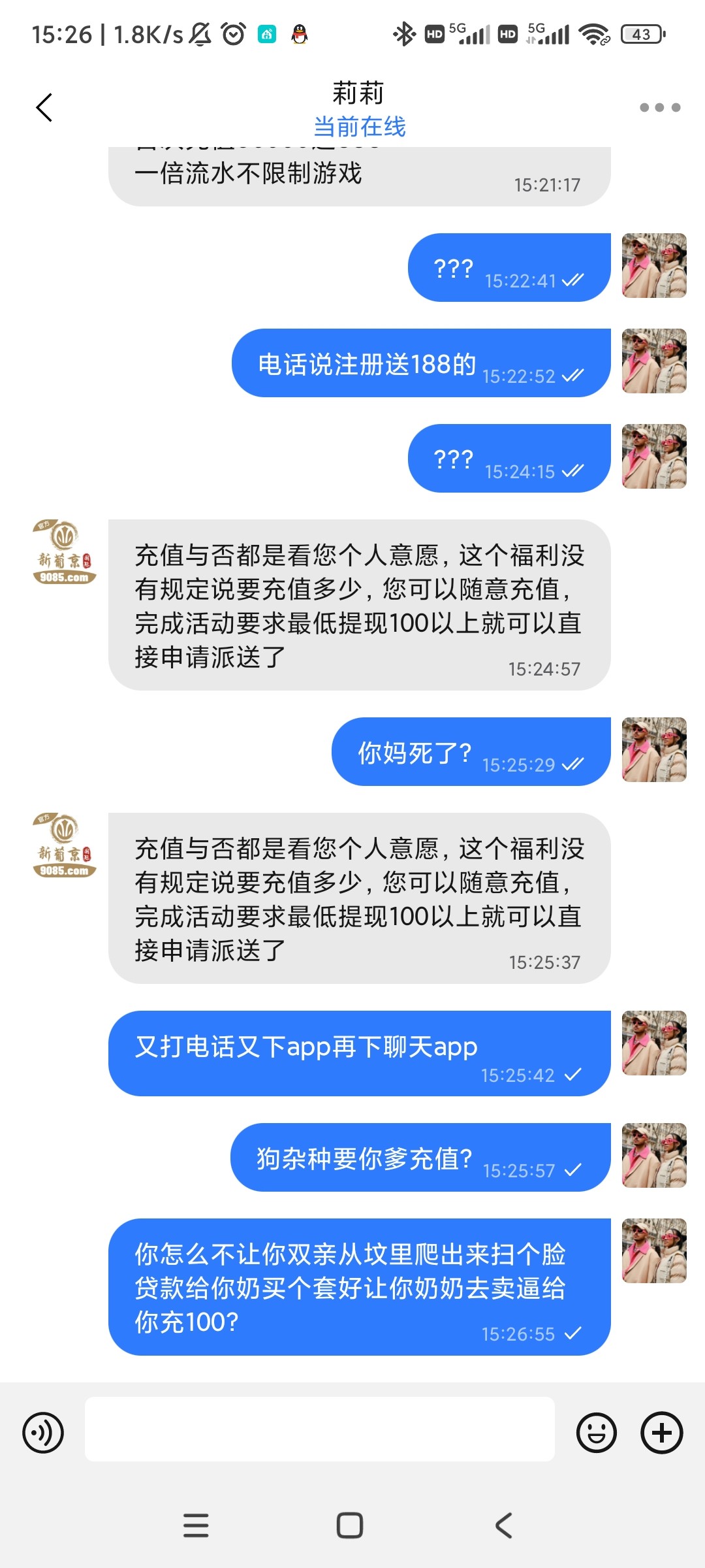 我都不知道你想什么,又打电话又下app又下聊天app最后还得充值送的狗台子,你真想去充值?