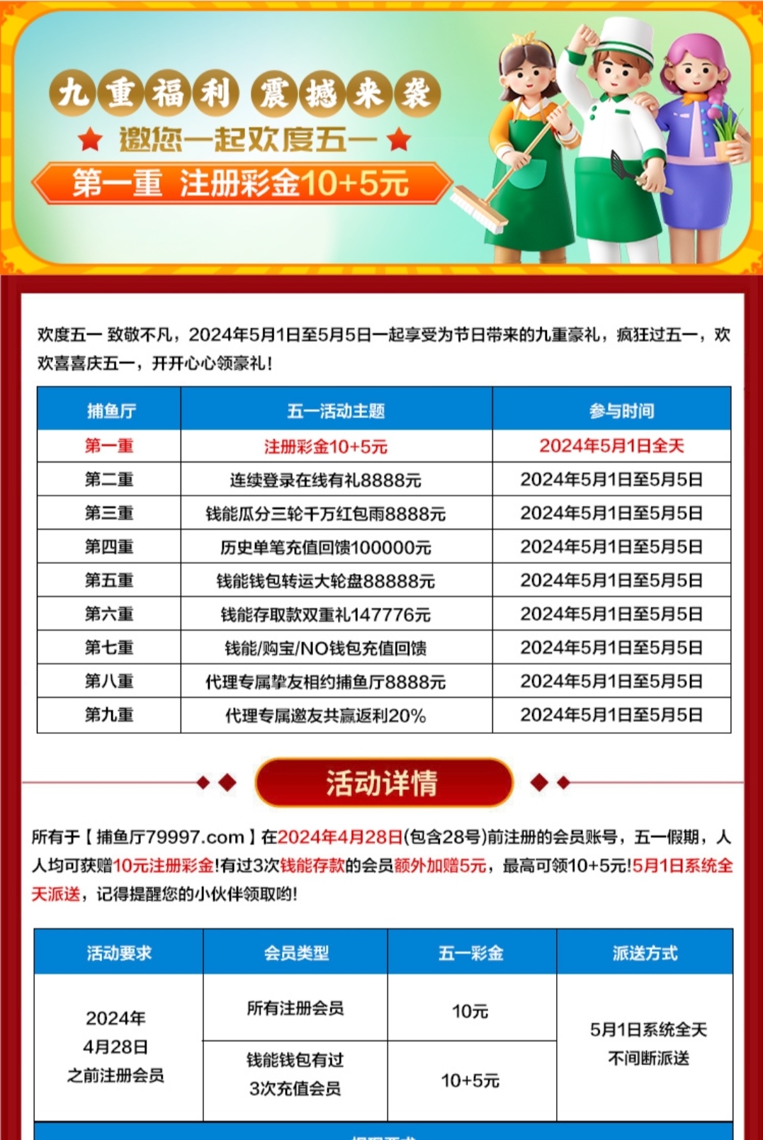 4月28号前注册的会员五月一号登录领取10免费彩金,老用户去新用户无视即可,具体自测,切记勿充值。