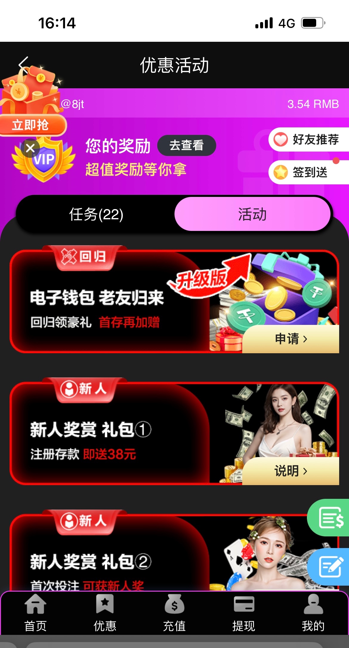 新人首存50送38 老用户回归送38 每日签到送3