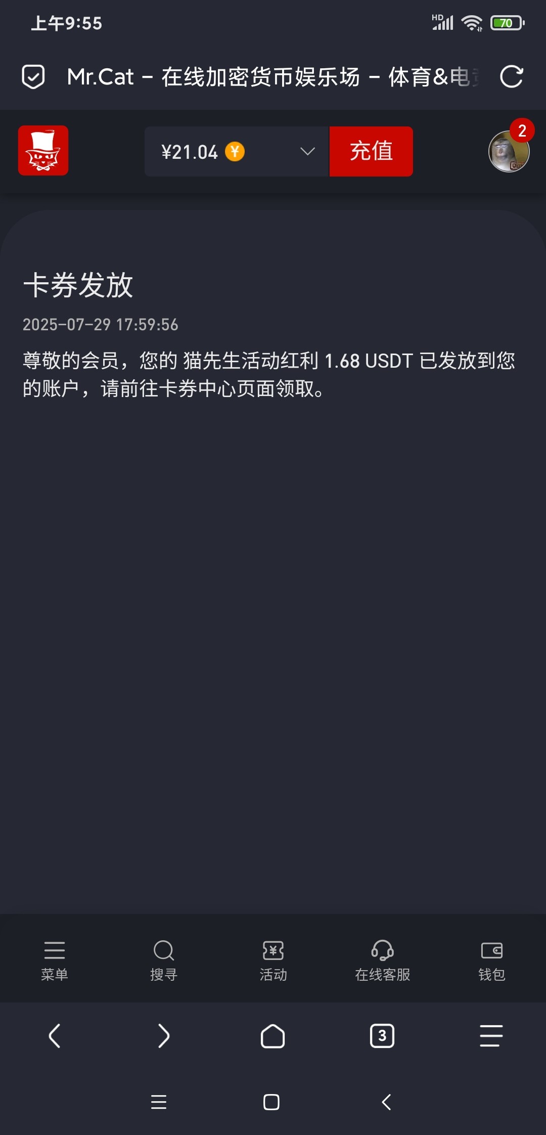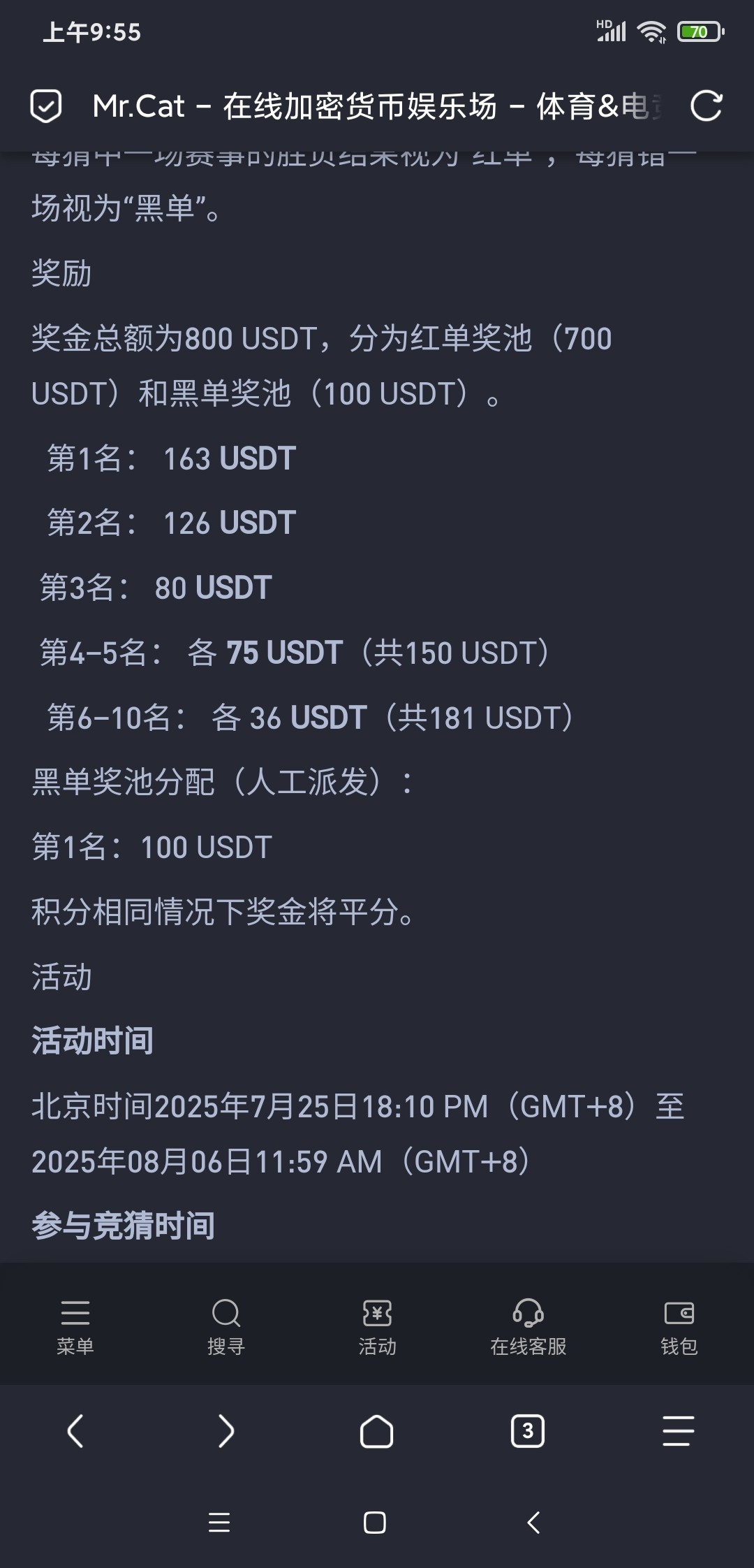 一直在白嫖这个,以前是猜精准足球比分,现在改成猜电竞输赢,容易中多了,但是中的人多了分的彩金也少了,猜哪边赢就可以了,赢的那边填1,不了解电竞的可以去看盘口看哪边水低无脑选哪边就行,每周能无脑白嫖个1U左右,1倍水不限游戏,大概周二或者周三下午派发,但是应该是不能玩彩票和电子包括原创游戏里那种高倍的,我都是玩电竞体育打出来的,可以点右下角货币转换按钮把单位换算成cny也就是人民币,这样就是五块八块可以进场馆下注了。
