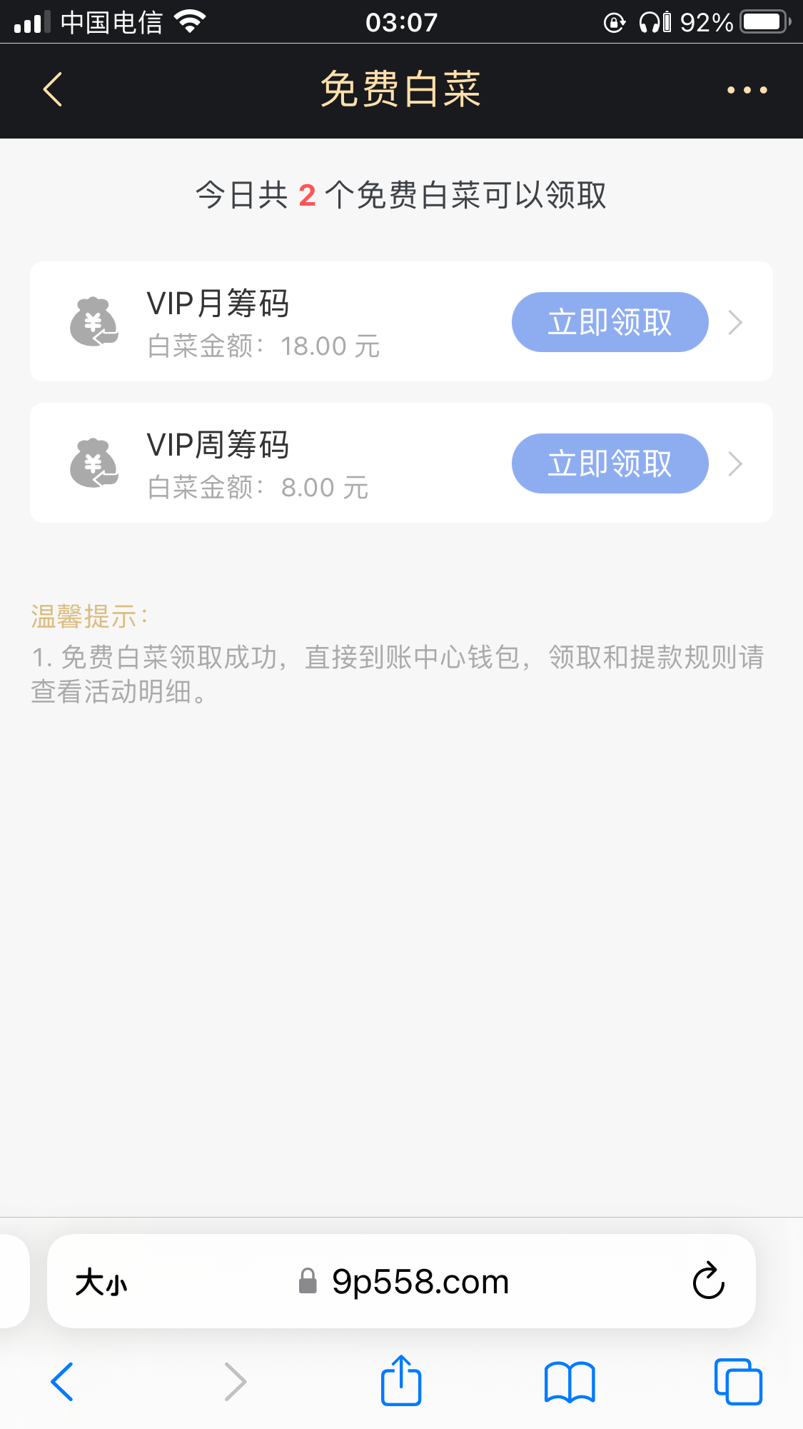 活动:新用户注册完善个人资料我的-红利-免费白菜自助领取8.88/100提